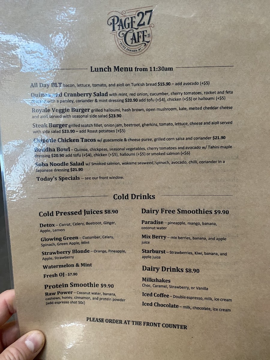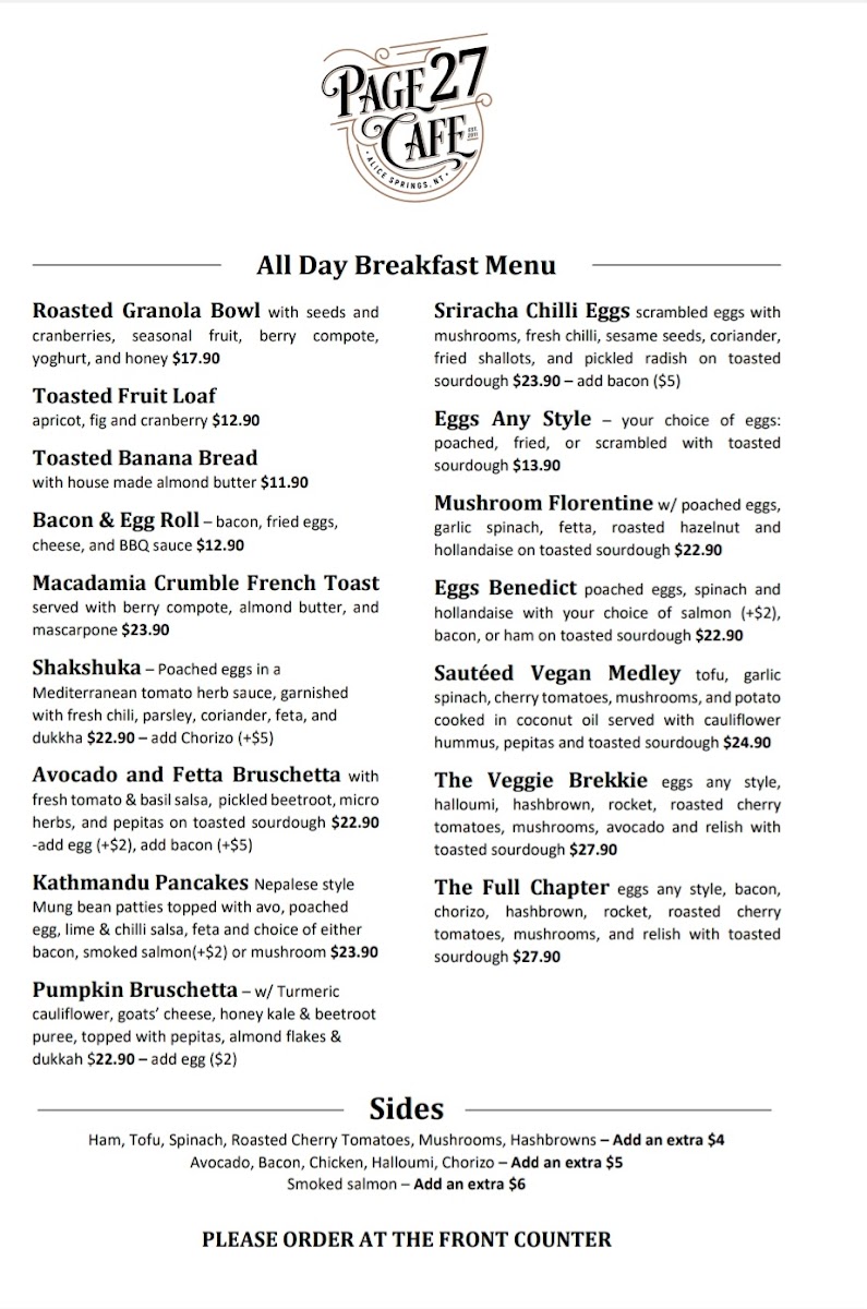 Welcome to Page 27 Cafe, a delightful eatery nestled in the heart of Alice Springs at 3 Fan Arcade. This cafe is a haven for breakfast lovers and coffee aficionados alike. As you step inside, you're greeted by a cozy, welcoming atmosphere, complemented by unique decor made from reclaimed furniture.